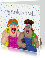 Een grappige verjaardagskaart met op de voorkant een vrolijke dame die hoog in de lucht springt op haar Grappige verjaardagskaart getekend door Ings kaartjes